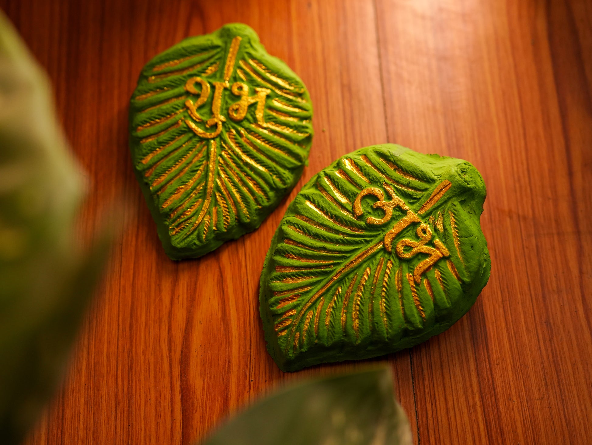 Leaf-shaped Gomay plaques inscribed with "Shubh" (Auspicious) and "Labh" (Profit). Ideal